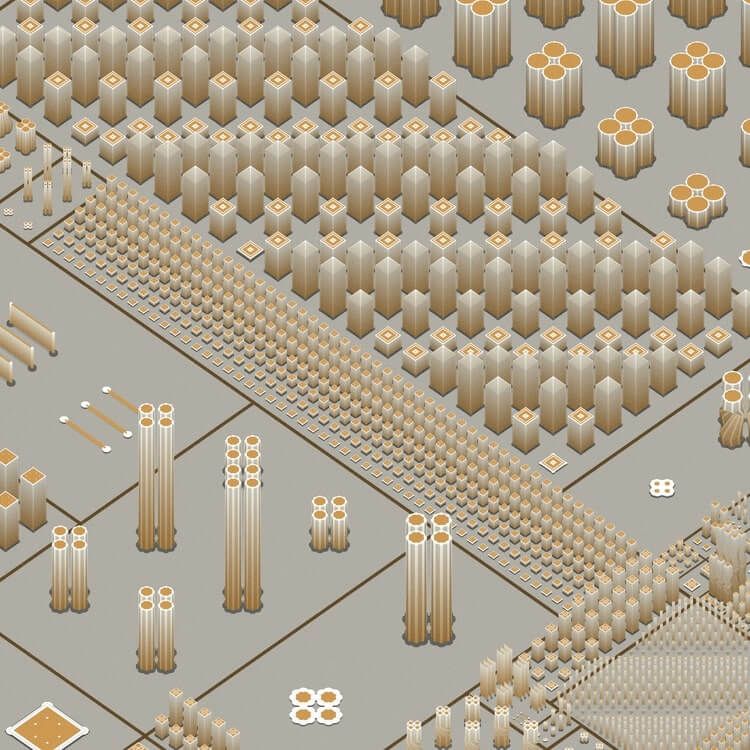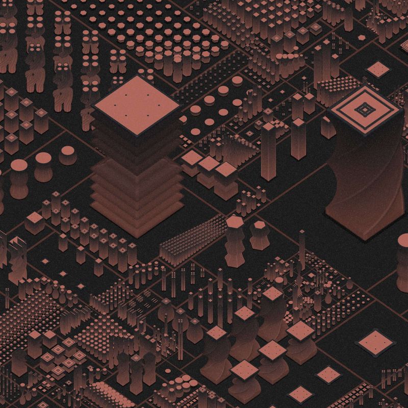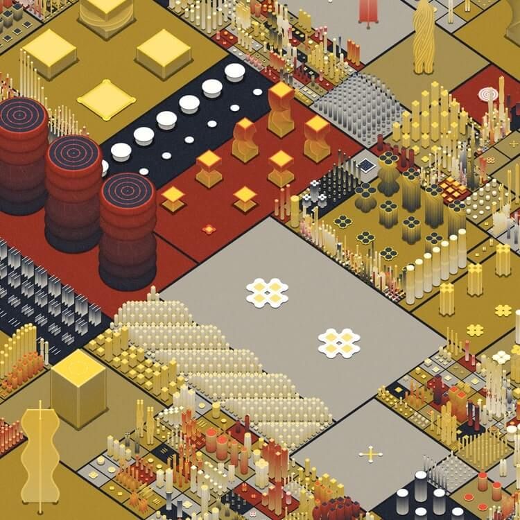 It unravels in the style of isometric illusions, each twist and turn carving out a depth, a dimension, luring the onlooker into a labyrinth of intricate details, of abstract forms blooming from the ground beneath.